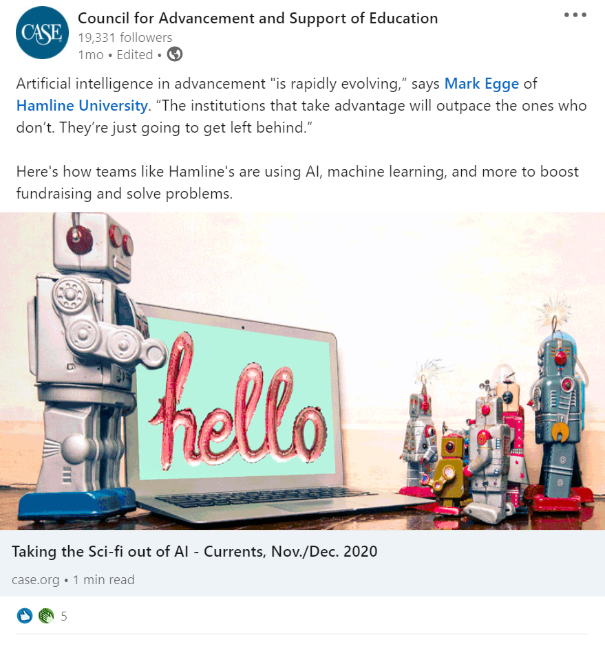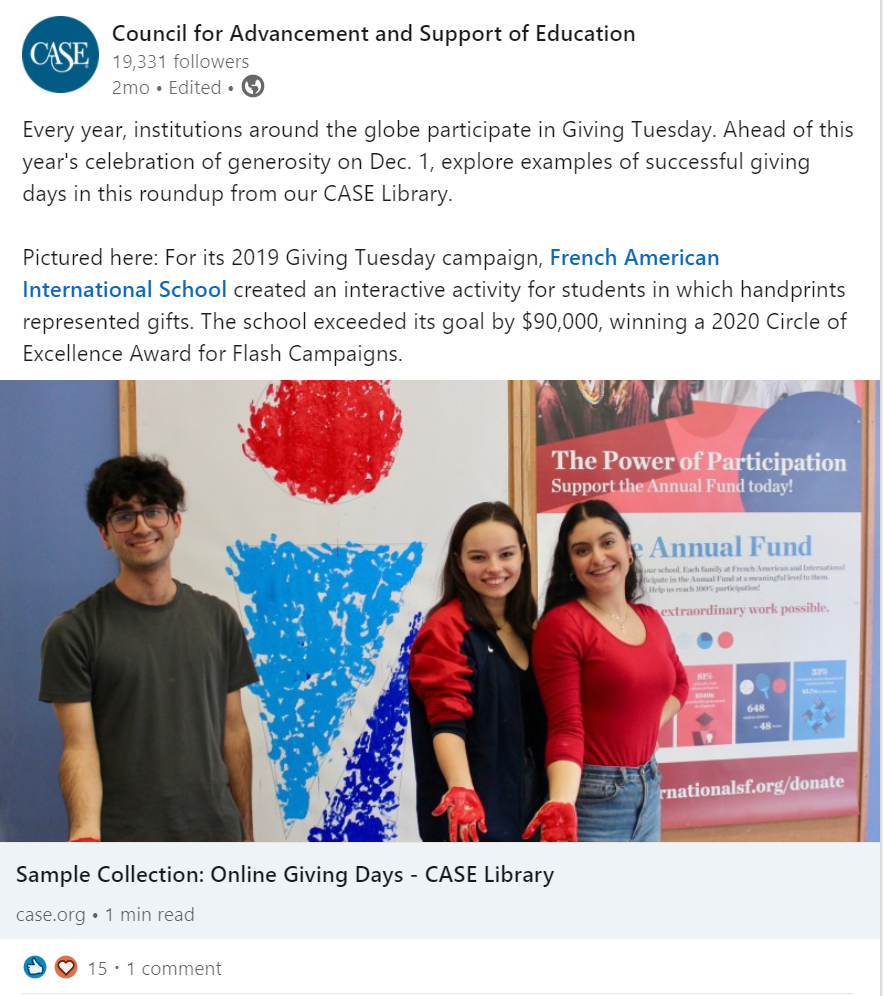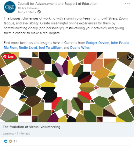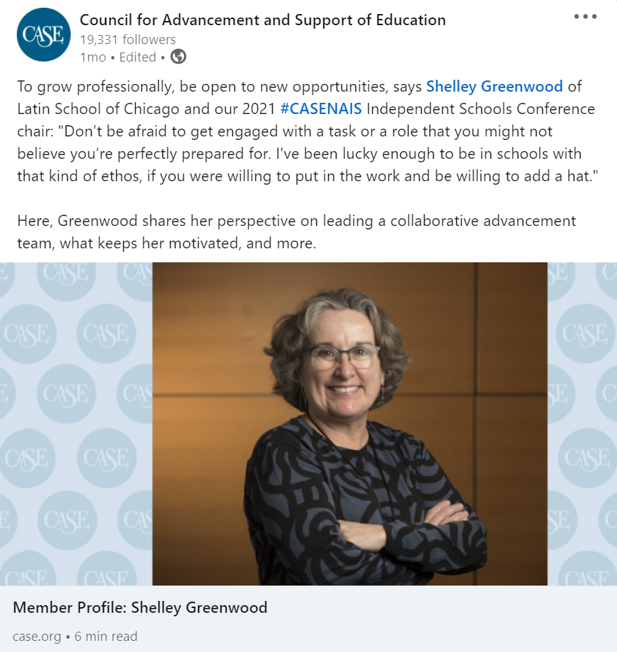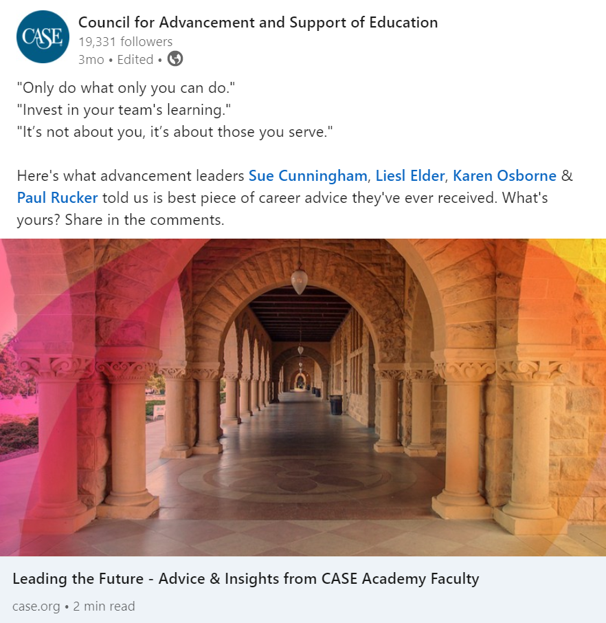 Relaunched CASE’s LinkedIn page, now CASE’s top social platform for engagement and one of the top social drivers of visits to case.org.